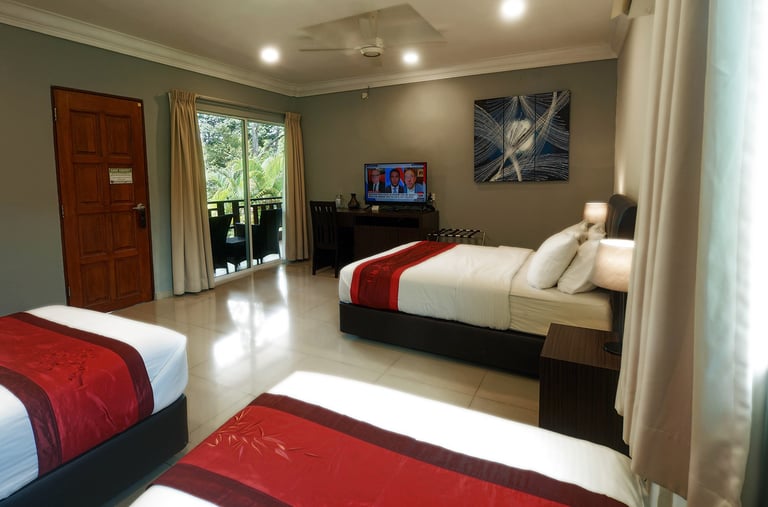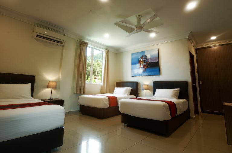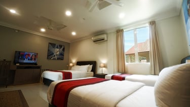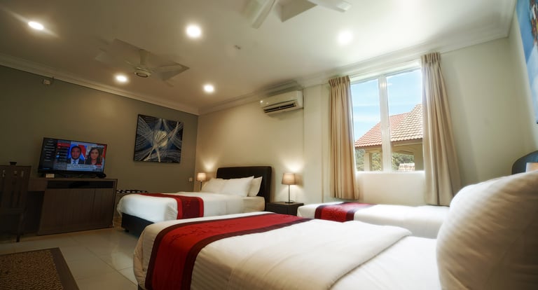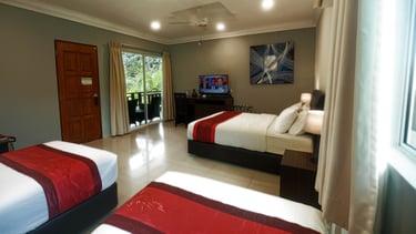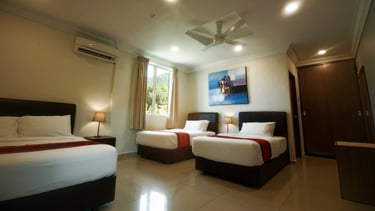 Deluxe Quad or family rooms are very spacious and come with a queen bed plus 2 single beds configuration.