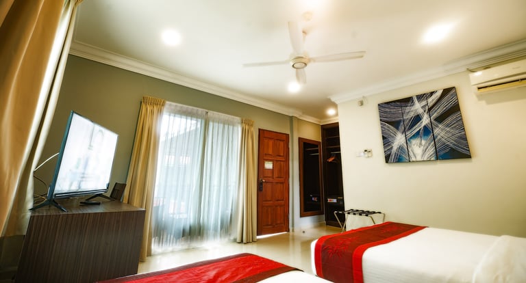 Expect elegantly furnished, air-conditioned rooms with ceiling fans, tiled flooring, a wardrobe, in-room safe, a fridge, kettle with complimentary tea/coffee and a flat-screen TV with Astro channels.