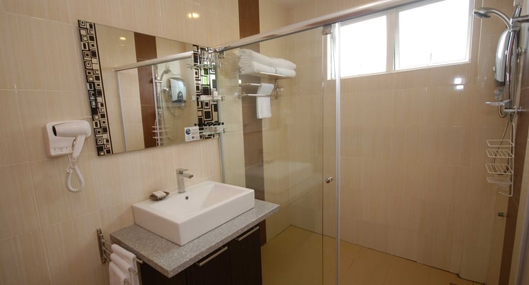 Experience comfort in well-appointed, air-conditioned rooms featuring ceiling fans and tiled floors. Amenities include a flat-screen TV with Astro channels, fridge, desk, wardrobe, kettle with complimentary tea/coffee, and a secure in-room safety box.