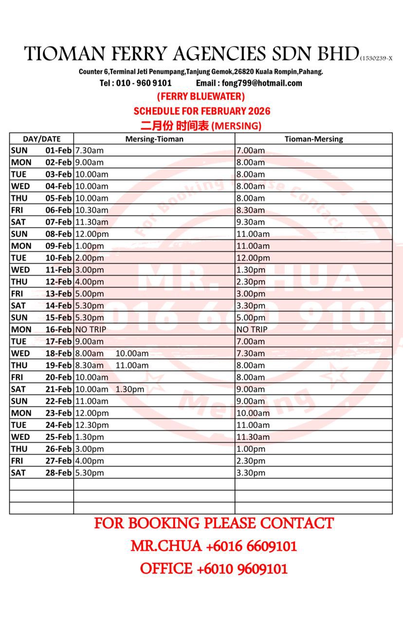 www.tiomanferryticket.comIf they list "no trip" or "unavailable" then don't worry, it simply means that tickets are not bookable yet. Check back a week or so later or contact us.