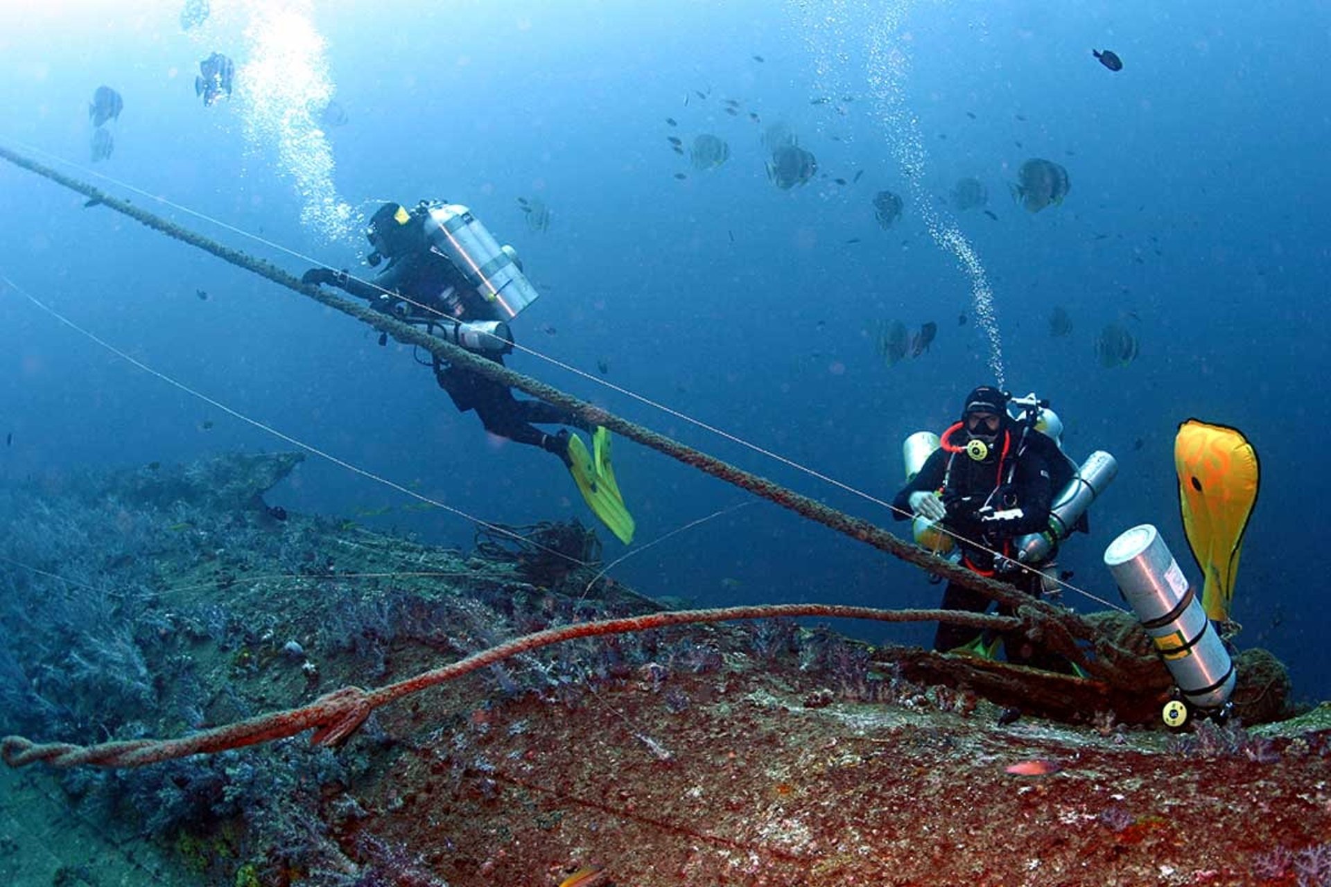 Mastery of the technical diver rig brings all dive sites in the 50 meter range within your capabilities. The use of decompression techniques within this depth range allows for multi-hour bottom time dives to be planned allowing for serious exploration of shipwrecks or unvisited deep coral reefs without the ‘deco’ indicator of your computer beeping at you to ascend just as the exploration becomes interesting!